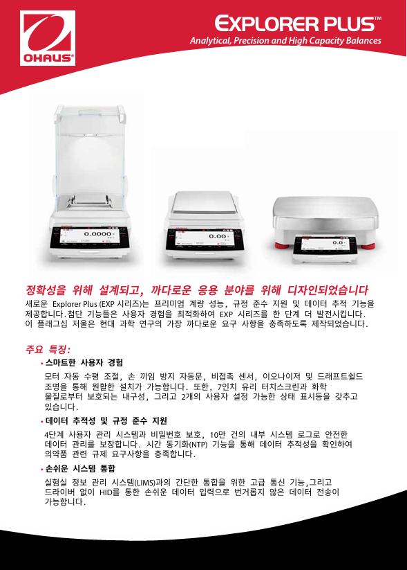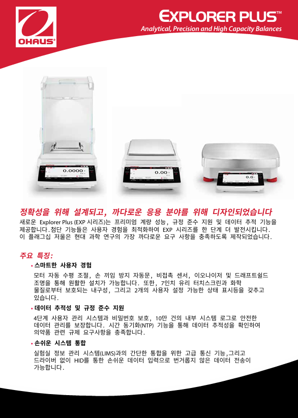새로운 Explorer EXP 시리즈는 프리미엄 계량 성능, 규정 준수 지원, 데이터 추적 기능을 제공합니다. 첨단 기능으로 사용을 최적화해 EXP의 가치를 한 단계 높였습니다. 이 플래그십 밸런스는 현대 과학 연구의 가장 까다로운 요구를 충족하도록 설계되었습니다
